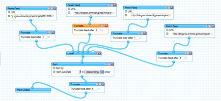 異なるフィードを合体させたりソートしたりするサービスでYahooPipesってのがあるんですが超優秀ですコレ。普通FlashでBlogのxmlにアクセスするためにはセキュリティ ー上サーバー側で許可してないと無理なんですが、YahooPipesはそういった制限がない上にフィードを自由にカスタムできるので一度YahooPipesにフィードを読み込ませてしまえばなんだってできちゃいます。このstealthコミュニティを作ろうと思ったのもコイツがあったからこそです。フィルターとかの応用例もこのサイトに詳しく書いてあります。
